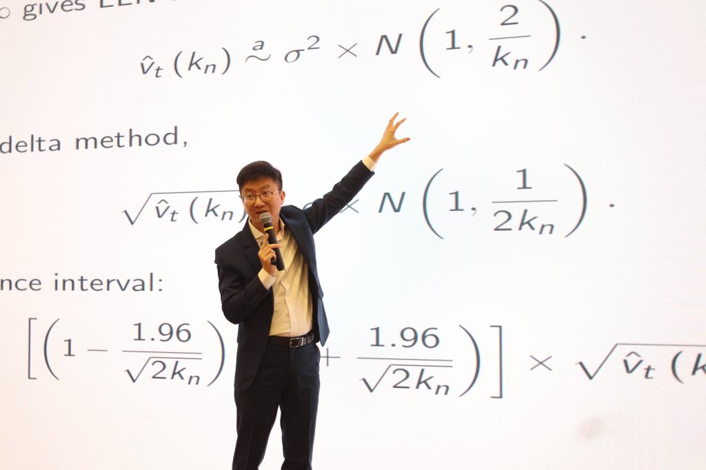 李嘉教授系统阐释了金融市场风险的研究价值。他指出波动率是衡量金融资产风险水平的核心标尺。随着高频数据的普及,学术界与业界对能够反映市场瞬息变化的“即时波动率”的统计推断需求日益迫切。针对传统基于高频收益率的估计方法因依赖有限局部信息而导致的样本扭曲难题,李嘉教授创新性地借助日内高频K线数据中蕴含的丰富信息,构建了名为“OK”的即时波动率非参数估计量。该研究不仅在严谨的渐近填充框架下证明了OK估计量具备渐近无偏性,并论证了其在同类线性估计量中拥有最小的渐近方差,更关键的是,其估计误差可通过布朗泛函进行耦合。这一特性使得研究者能够利用其在有限样本中已知的非标准分布,精准构建即时波动率的置信区间,其精确度在理论与实证中均显著超越了依赖传统高频收益率的方法。