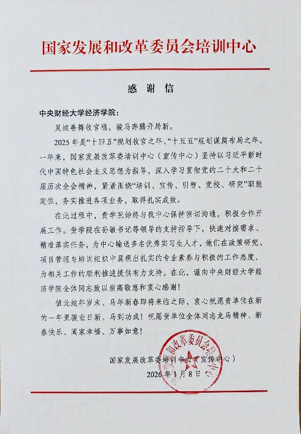 近日,经济学院收到来自国家发展改革委培训中心(宣传中心)的感谢信,信中高度肯定了学院在人才输送、政校合作方面的务实贡献,并对学院全体师生致以崇高敬意和衷心感谢。